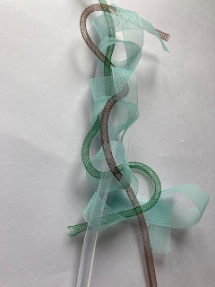 With the next yarn I was pleased to have finally found a use for a material I had stored away for a moment just like this. I had a stash of crinoline tubing and ribbon, using the ribbon twisting it into loops and stitched them into place. Then using the loops to lace through the crinoline tubing. The structure of crinoline reminded me of the soft glass colours of sea glass.